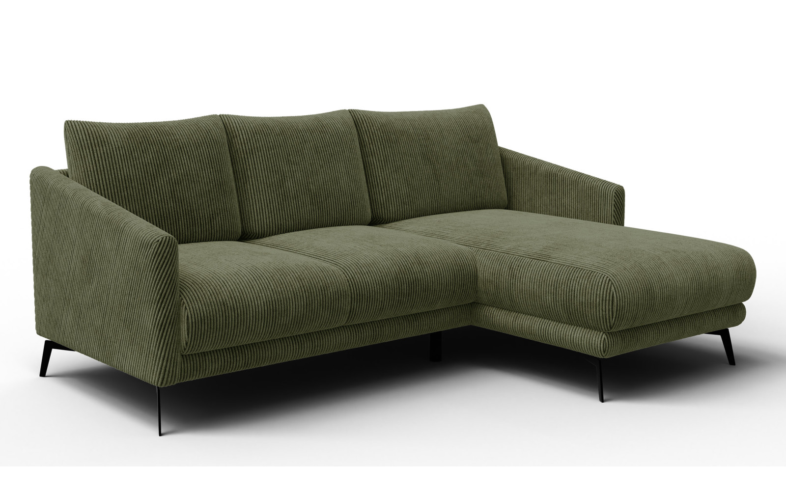 Tissu: Velours côtelé d’ameublement avec une largeur de bande de 1cm. Tissu doux et moelleux avec des poils veloutés, très agréable au toucher. Changement de teinte en fonction de la direction de la position des cheveux. 100% Polyester, 350 g/m2, 35.000 Martindale, pilling resistance: 5, lightfastness: 4-5, couleur olive.