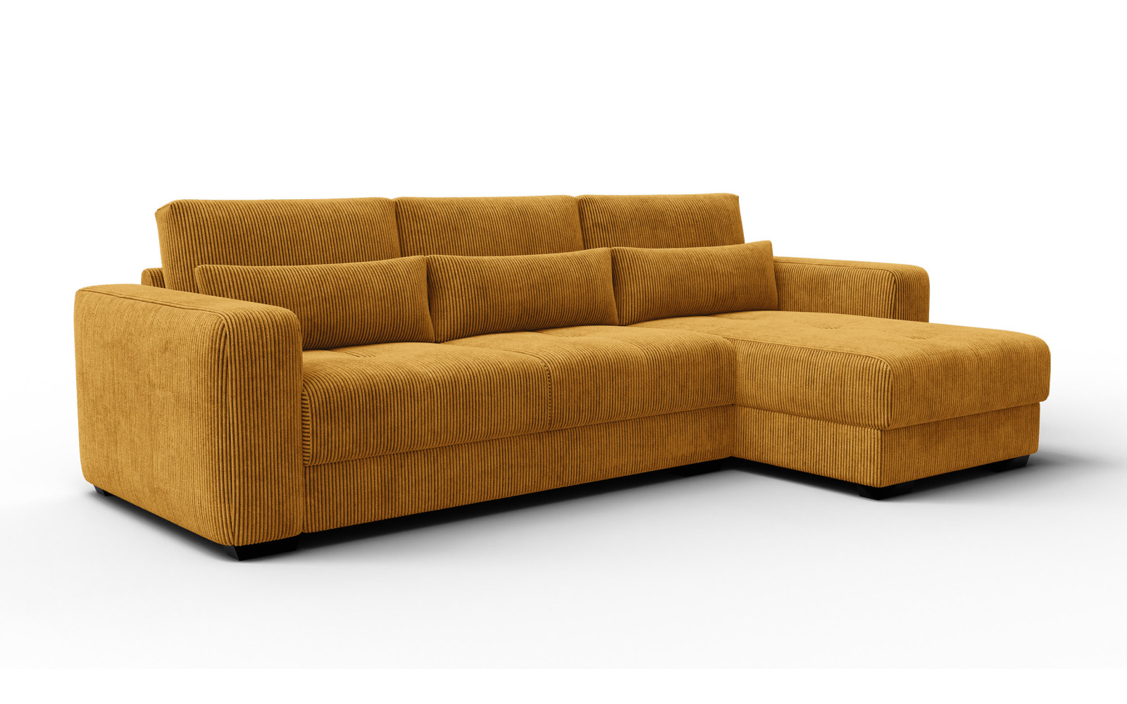 Canapé d'angle droit 4 places OLI, jaune foncé - Description :Introduire dans un intérieur un élément alliant design moderne et ambiance chaleureuse est essentiel pour créer un salon parfait. Le canapé d'angle droit OLI 4 places, jaune foncé, est idéal pour ceux qui n'ont pas peur des couleurs audacieuses et élégantes. Sa teinte, évoquant les chauds rayons du soleil ou une nuance de miel, dynamise instantanément la pièce et lui confère un caractère unique. Ce meuble devient non seulement un lieu de détente, mais aussi un point focal de la décoration, attirant le regard et invitant à profiter pleinement de son chez-soi. Les concepteurs du modèle OLI ont privilégié une forme à la fois massive et visuellement légère grâce à des proportions harmonieuses. Les lignes arrondies et les larges accoudoirs s'inscrivent dans les dernières tendances en matière de décoration intérieure, et l'absence d'angles vifs renforce l'impression de douceur. Le canapé d'angle OLI 4 places jaune foncé s'intègre parfaitement aux murs clairs de style scandinave comme aux lofts plus sombres et chaleureux, créant un contraste original avec l'environnement. Pourquoi le canapé d'angle OLI jaune foncé est un choix dynamiqueL'originalité de ce meuble réside dans son revêtement. Il s'agit d'un velours côtelé de haute qualité, à larges rayures de 1 cm, d'une douceur incomparable. La texture du tissu permet à la lumière de jouer magnifiquement sur sa surface, et sa teinte varie selon le sens du poil. Ce jeu d'ombre et de lumière confère au canapé d'angle OLI 4 places une allure dynamique et raffinée, et chaque contact est un pur plaisir pour les sens. Le confort est tout aussi important que l'esthétique. L'assise, garnie d'une mousse souple et mi-ferme, offre un soutien optimal du corps sans s'affaisser excessivement, un point essentiel pour la santé de la colonne vertébrale. Cela rend les heures de détente avec un livre ou un marathon de films véritablement apaisantes après une dure journée. Des coussins décoratifs supplémentaires de couleur contrastante rehaussent non seulement l'apparence du canapé, mais offrent également un appui-tête ou un dos confortable. L'ensemble de la structure repose sur de petits pieds bruns de quatre centimètres. Discrets, ils assurent une base solide et complètent subtilement la couleur chaude du revêtement. La stabilité du canapé d'angle droit OLI 4 places, jaune foncé, s'allie à sa durabilité, ce qui en fait un investissement pour de nombreuses années d'utilisation sans souci au sein de la famille. Tissu velours côtelé du modèle OLI : fonctionnalité et style réunisChoisir le velours côtelé comme revêtement n'est pas seulement une question de mode, mais aussi de praticité. Ce tissu se caractérise par une grande résistance à l'abrasion, un atout essentiel pour un meuble destiné à quatre personnes. Le revêtement moelleux et velouté rend ce canapé confortable et facile d'entretien. Les coutures solides et le soin apporté aux finitions témoignent de la qualité de ce produit. Il convient de souligner l'espace offert par ce modèle. Malgré ses dimensions compactes, idéales pour les appartements, la surface d'assise est impressionnante. La profondeur d'assise de 50 cm assure un confort optimal, et le canapé d'angle droit permet de créer facilement un coin détente dans le salon. Ce meuble invite à la convivialité, offrant un espace généreux pour tous. En choisissant ce modèle, vous créez une ambiance chaleureuse et accueillante dans votre intérieur. Le canapé d'angle OLI jaune foncé prouve qu'un mobilier fonctionnel peut être esthétique et susciter des émotions positives. Sa présence dans le salon complète l'intérieur et confère aux moments de détente quotidiens un cadre empreint de style et d'une élégance naturelle. |