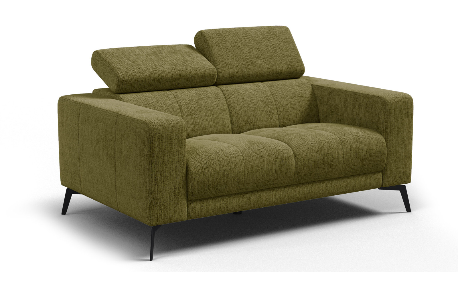 Canapé 2 places MORELLO en tissu chenille olive, doux et moelleux au toucher, résistant à l’usage (45 000 Martindale) et facile à intégrer dans un intérieur lumineux et élégant.