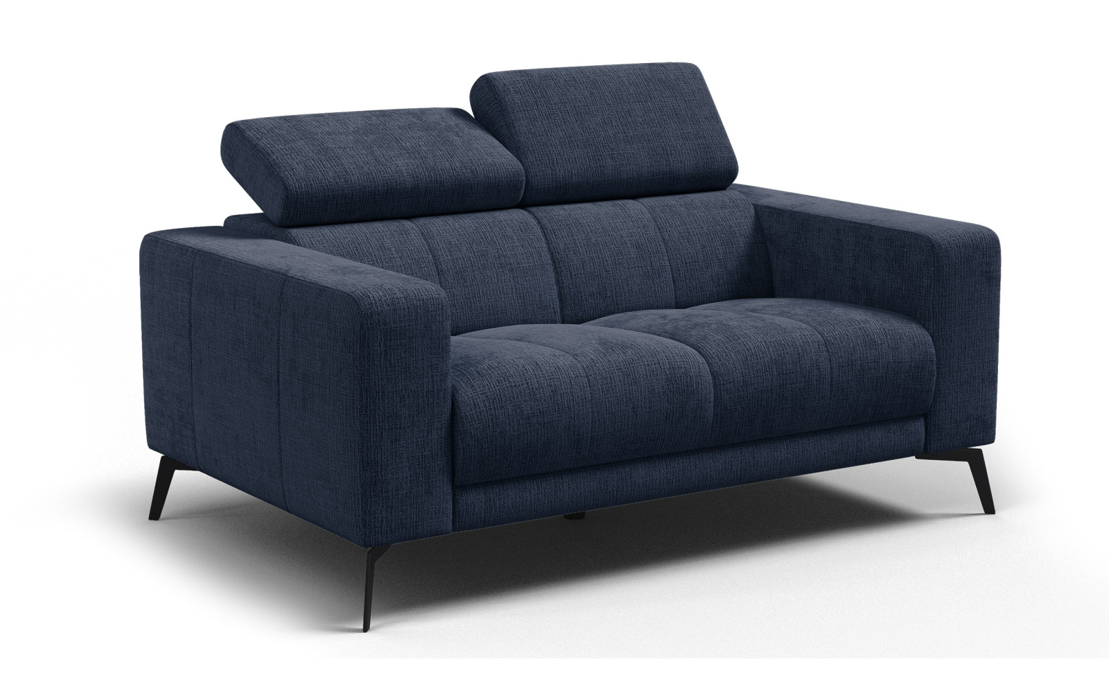 Canapé 2 places MORELLO en tissu chenille bleu marine, doux et moelleux au toucher, résistant à l’usage (45 000 Martindale) et facile à intégrer dans un intérieur lumineux et élégant.